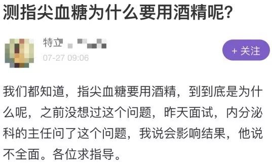 @ 特立 ***:指尖血糖要用酒精消毒,到底是为什么呢?昨天面试,内分泌科主任问了这个问题,我说会影响结果,他说不全面。求指导。